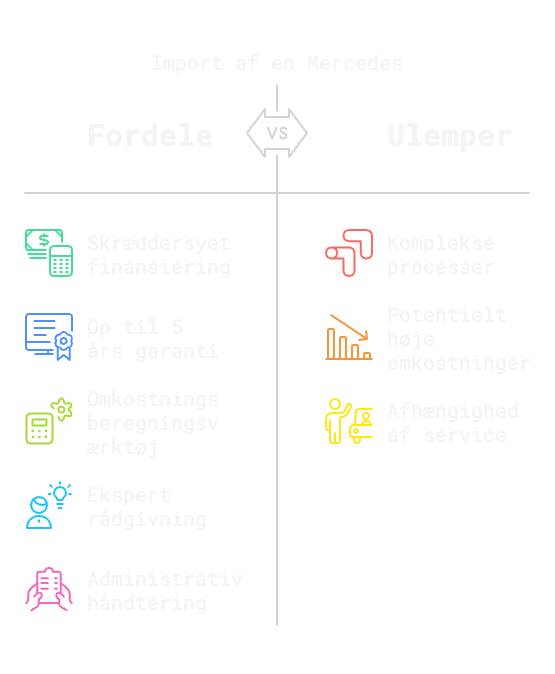 Hos os i IAB opnår vi en enestående kombination af ekspertise, tryghed og solide garantiordninger, når vi håndterer import af Mercedes. Vores mange års erfaring med bilimport gør, at vi nøje forstår de komplekse regler og procedurer, der er forbundet med import af biler, og vi benytter et avanceret beregningsværktøj med realtidsberegninger for at sikre, at alle omkostninger, såsom registreringsafgift, moms og told, er nøje beregnet og gennemsigtige.